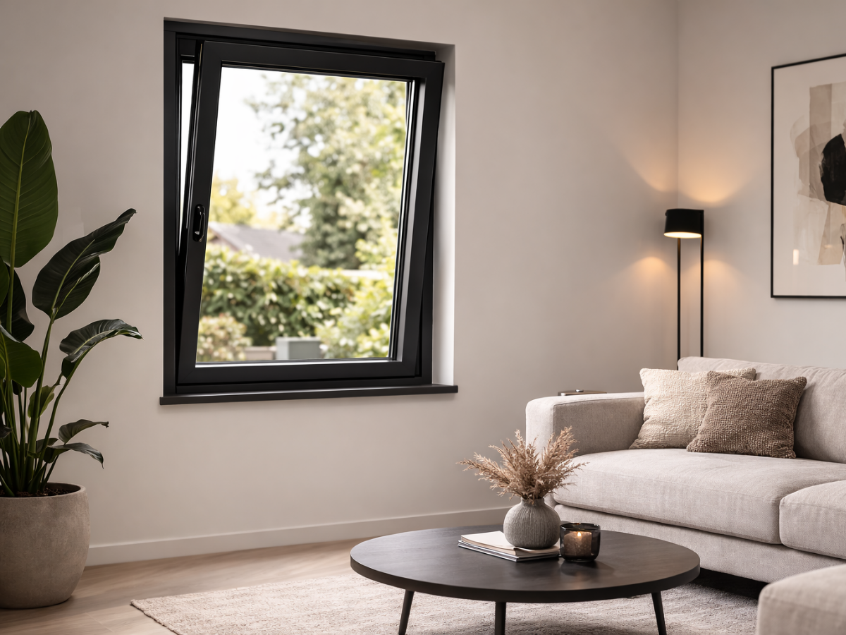 Kunststofffenster weiß, Kunststoffrahmen in Kippstellung, schlankes modernes Profil ohne Verglasung